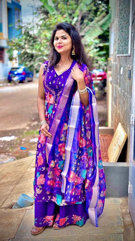 Regular price Rs. 1,999.00Regular priceUnit price / perRs. 2,750.00Sale price Rs. 1,999.00Paper silk embroidered floral pattern palazzo 3 piece set