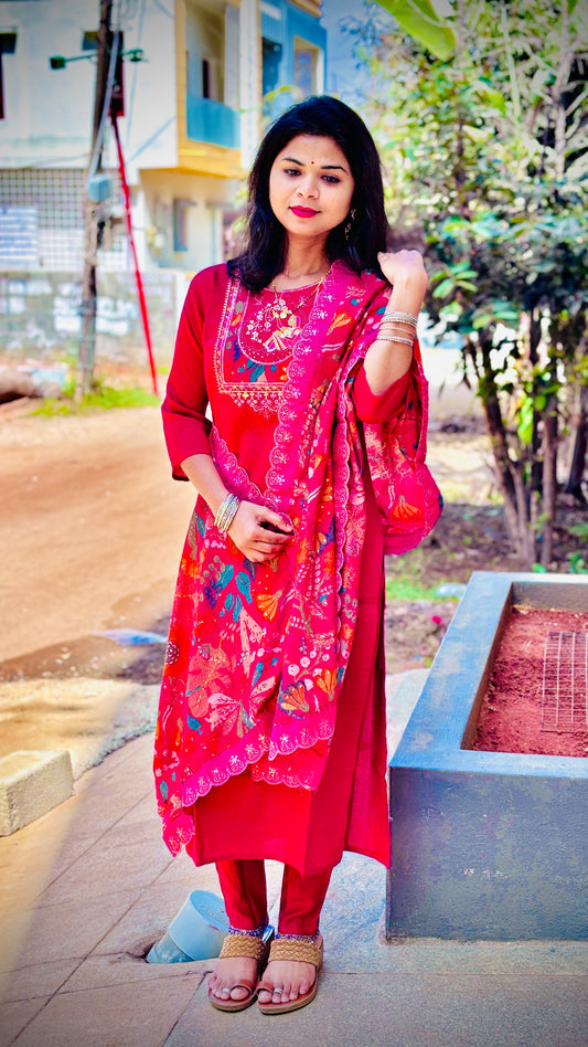 Floral motif embroidered 3 piece Kurta set-SDSE